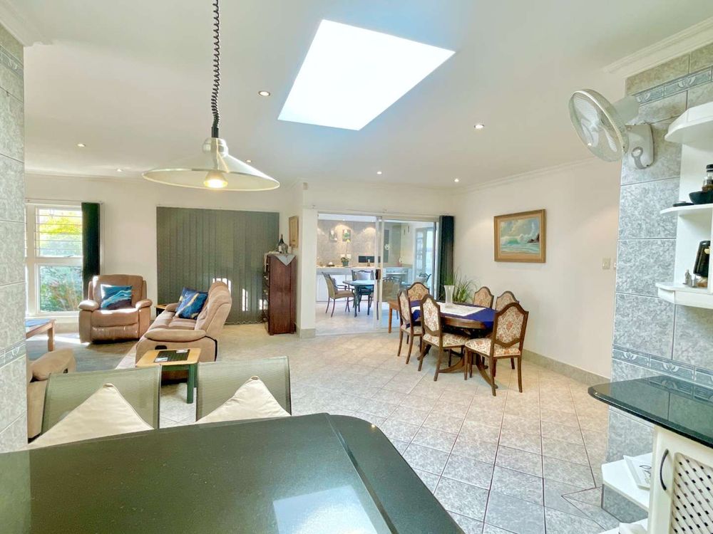 Designed with practicality in mind, the townhouse boasts a well-thought-out layout. Upon entering, you'll find a cozy nook on the right, perfect for setting up your study area. The home opens up into an inviting open-plan space that includes a kitchen with a scullery, a dining area, and a lounge. This area seamlessly extends to an enclosed braai area, complete with a jacuzzi. It's the perfect spot for year-round entertainment, allowing you to enjoy both winter and summer with sliding doors that lead to a charming small garden featuring a tranquil water feature.