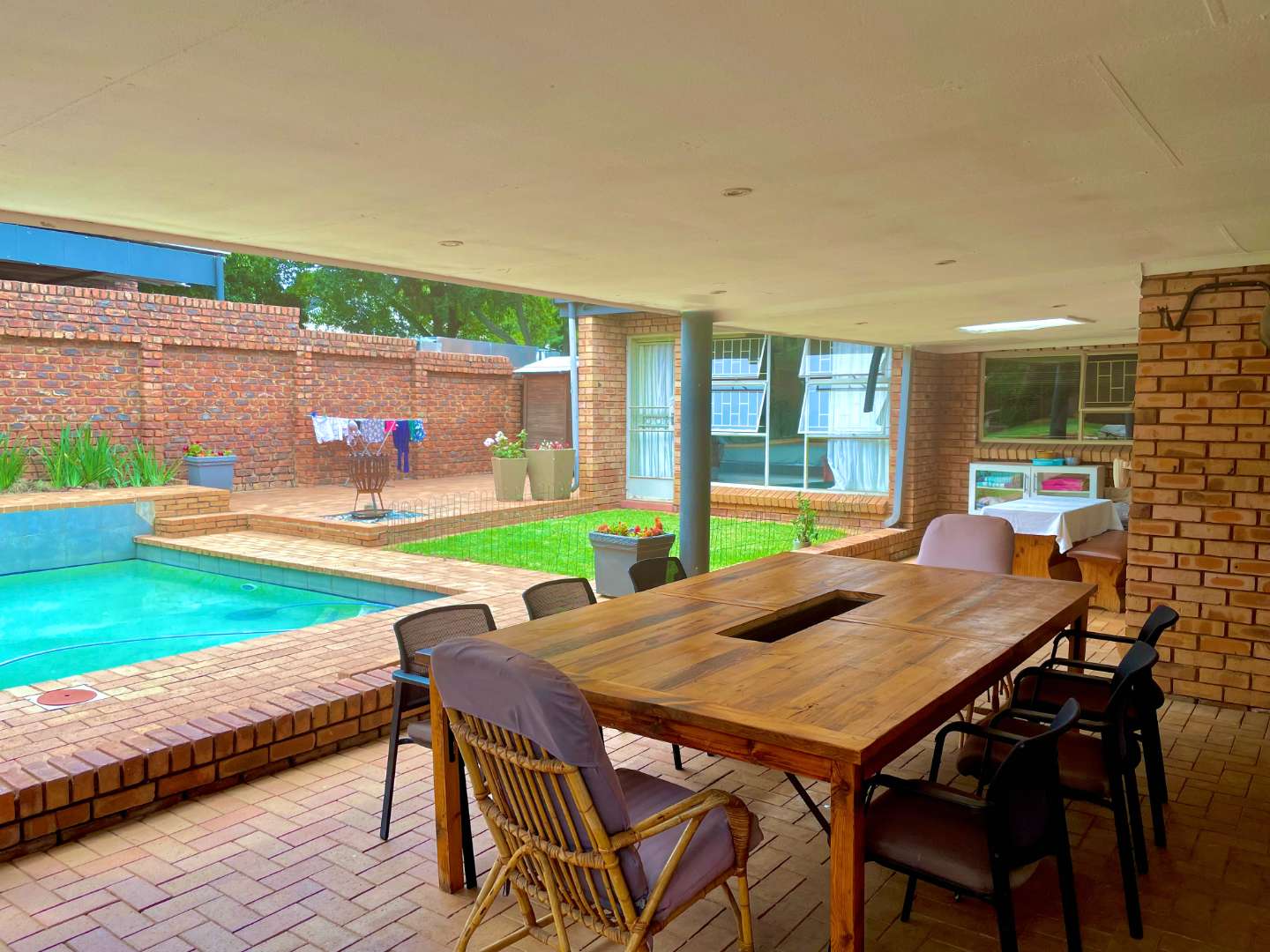 The kitchen, equipped with granite countertops, both gas and electric stoves, and space for two refrigerators, including a large unit. A separate laundry room offers ample storage. A convenient serving window connects the kitchen to an expansive covered patio, complete with a built-in braai and private bar, overlooking the swimming pool—ideal for entertaining guests. An outdoor towel cupboard adds practicality to your poolside experience.