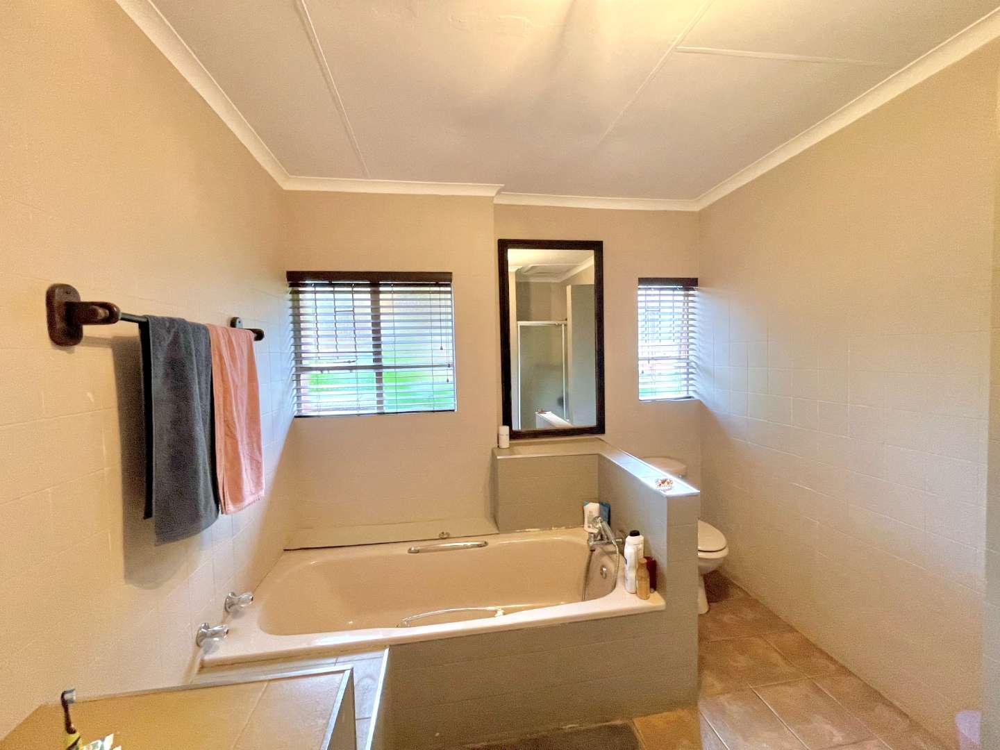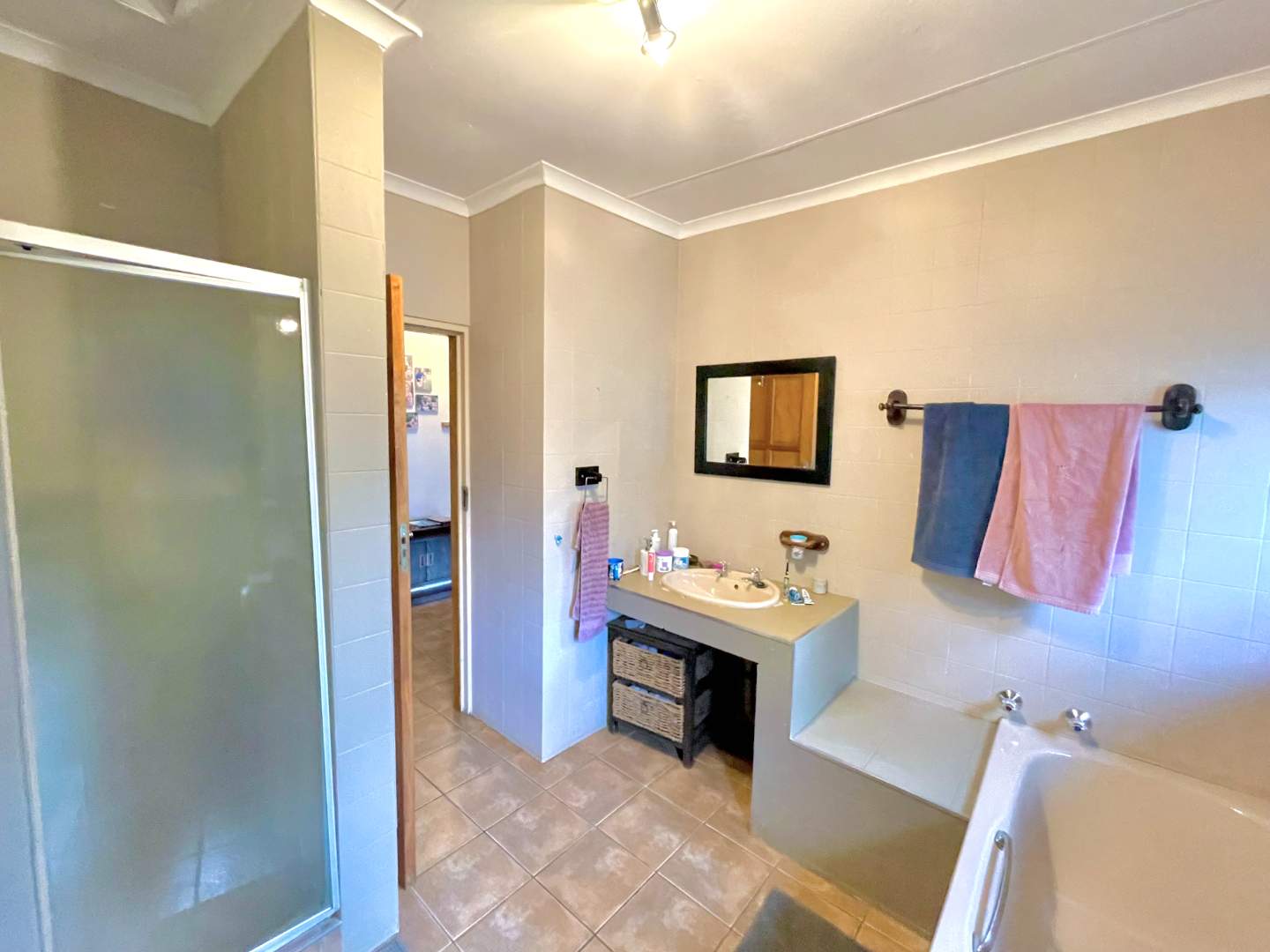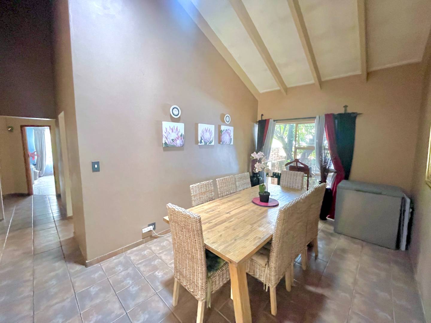 The main home includes two full bathrooms and a guest toilet. Upon entering, you are greeted by a welcoming entrance hall that leads to a spacious dining room and a cozy TV lounge. Newly added passage cupboards provide extra storage, while high ceilings throughout the home enhance its airy and spacious feel.