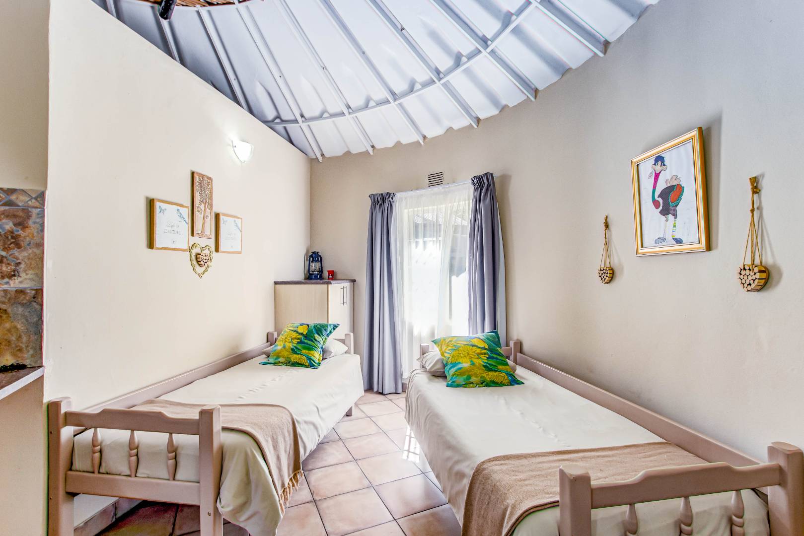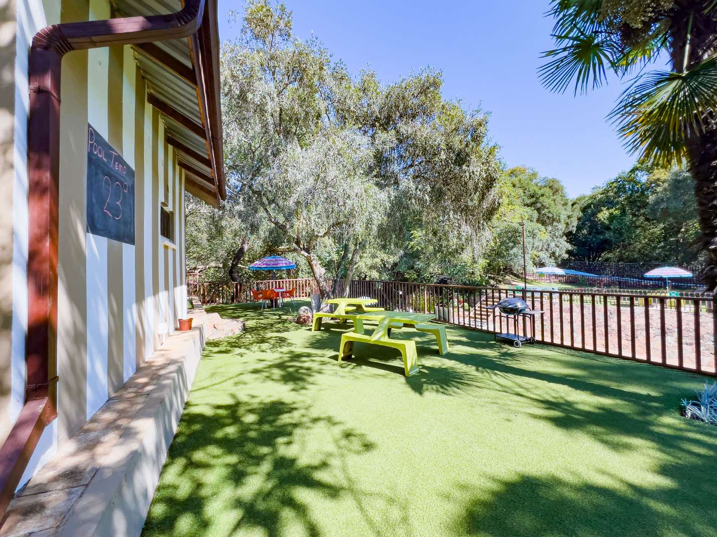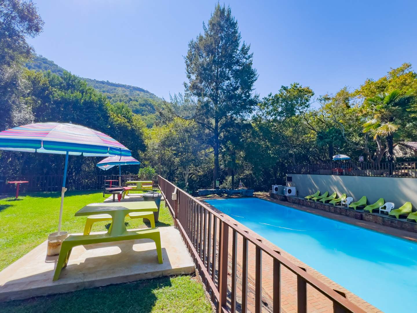 The main house is equipped as the owners' residence and resort office in one. The resort offers a heated swimming pool and water slide, kiddies' playground, putt-putt course, trampoline, pool table, table tennis, mountain bike trail, hiking trail (6Km), picnic/braai facilities and a kiosk for something sweet or the last-minute essentials. The resort runs with seven permanent staff members that have been with the owner since 2012.