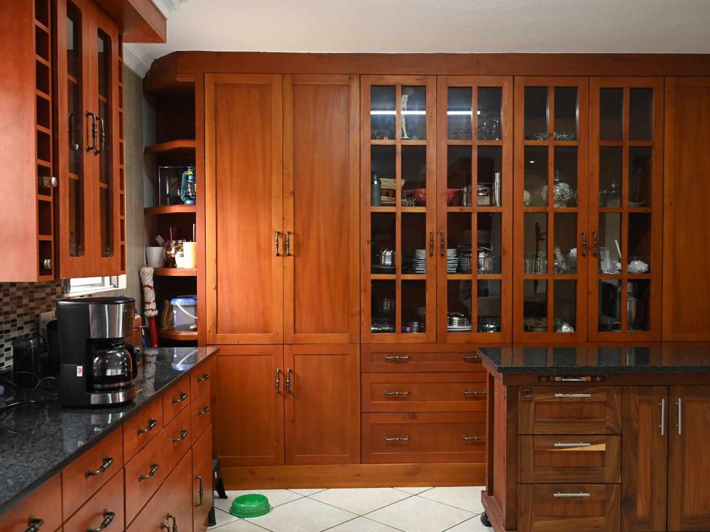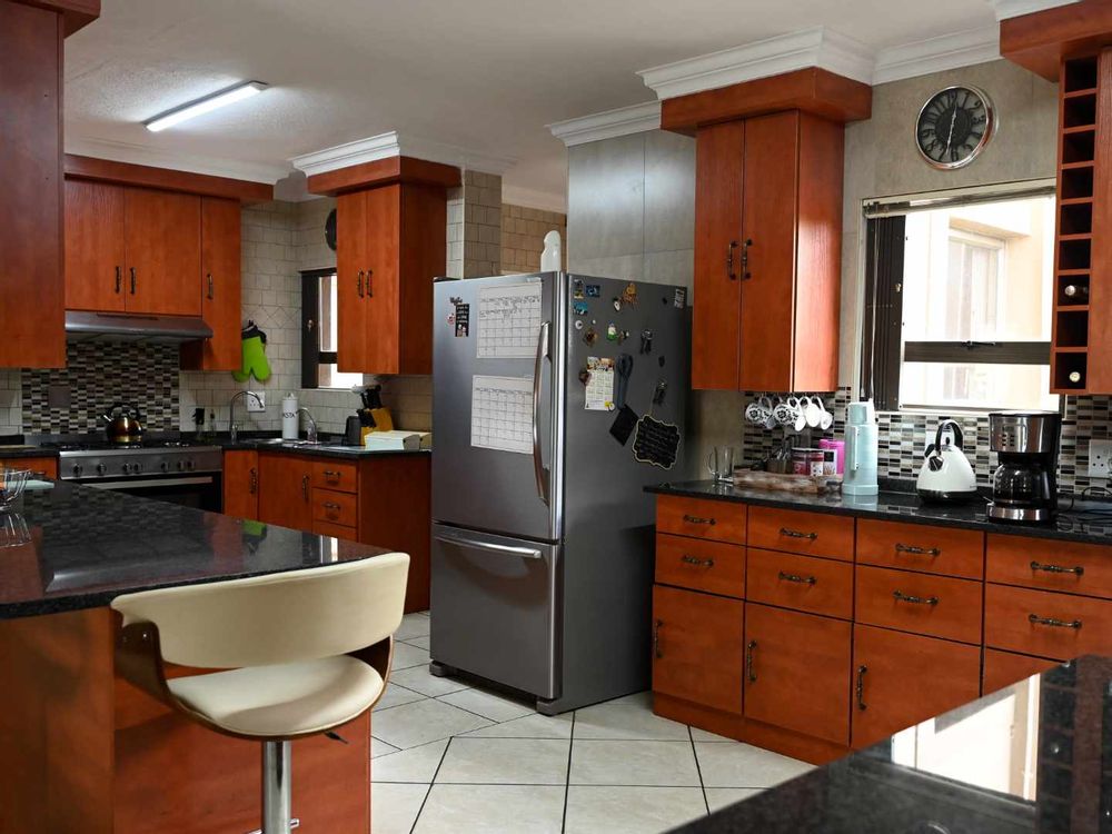 The expansive open-plan living areas are perfect for both relaxation and entertainment. The stunning modern kitchen is equipped with exquisite finishes, granite countertops, and abundant cabinetry, including an island and a practical grocery cupboard. It also features a breakfast nook, a modern gas oven as well as a gas stove, leading seamlessly to a convenient laundry/scullery area.