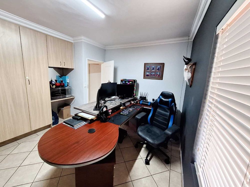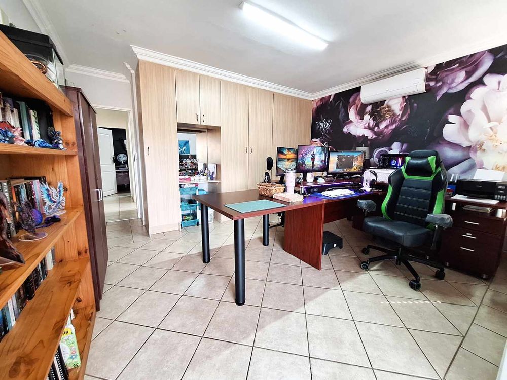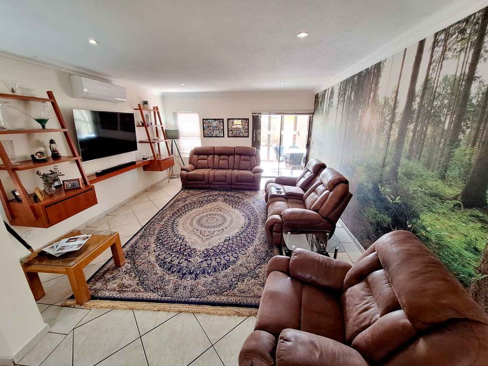 The spacious family/TV room, dining room, and lounge flow onto a spacious braai room with glass stack doors on two sides and and air conditioner, equipped with a built-in braai, providing a perfect view of the sparkling pool and beautifully landscaped garden.