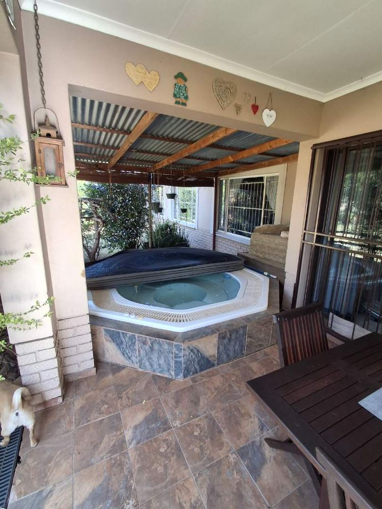 The covered patio is a highlight, featuring an 8-seater jacuzzi that promises hours of relaxation. For those who love outdoor entertaining, the boma and koi pond create a serene and picturesque setting. A single garage and carport accommodating up to four vehicles ensure ample parking space.