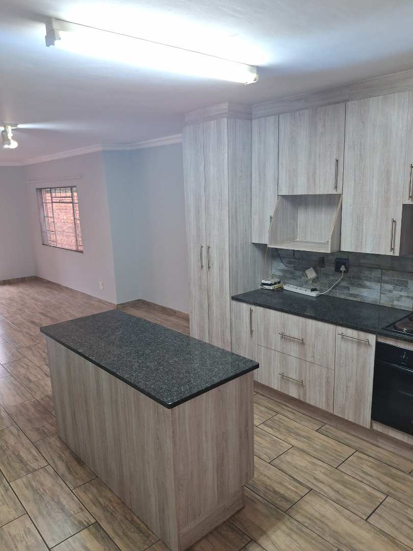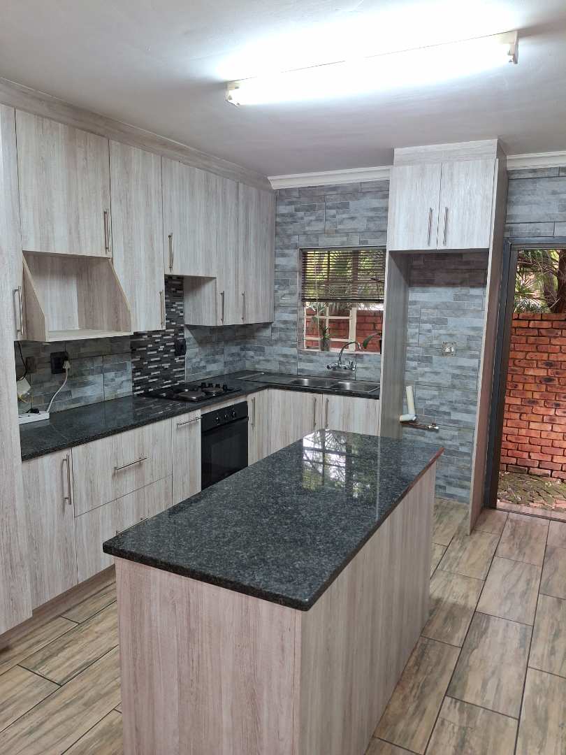 Modernised Kitchen (granite tops) with centre island, under counter space for 1 appliance, fridge (ample built-in cupboards and oven/hob), leading to back garden/court yard