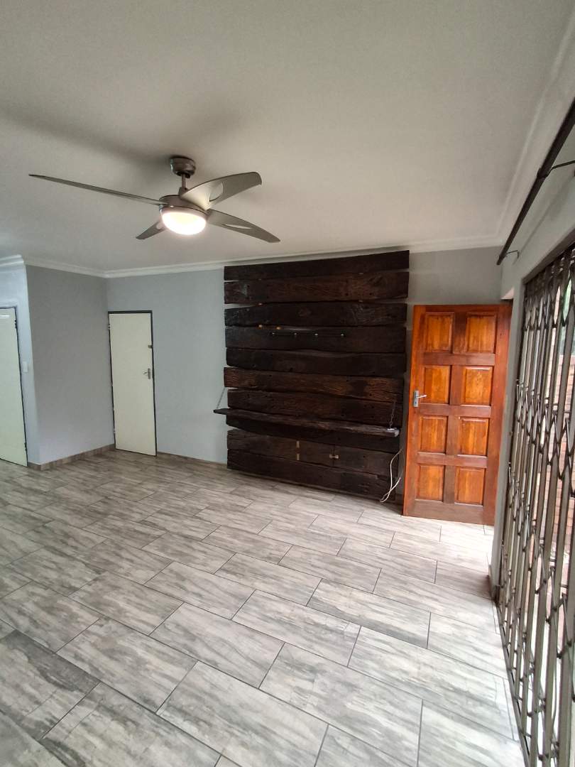 Large living area (open plan living/dining and kitchen area) leading to garden (secure slam-lock security gates on sliding and front door) - Sleeper wood TV unit included, ceiling fan