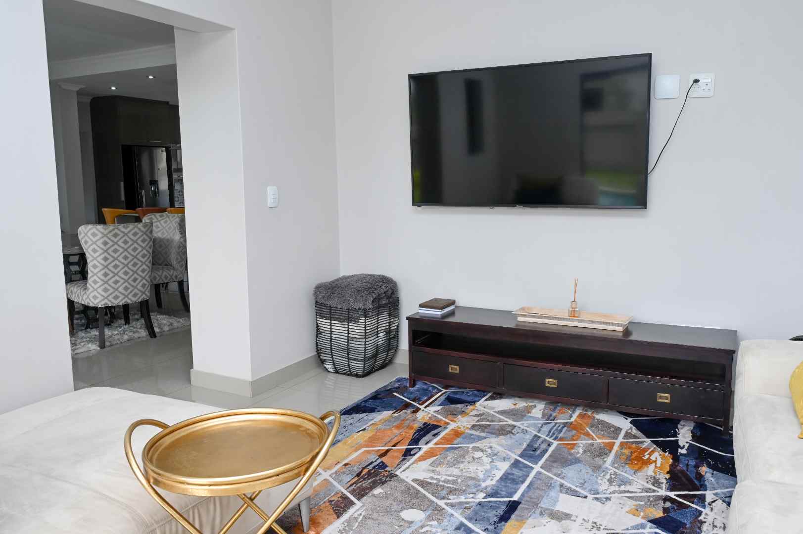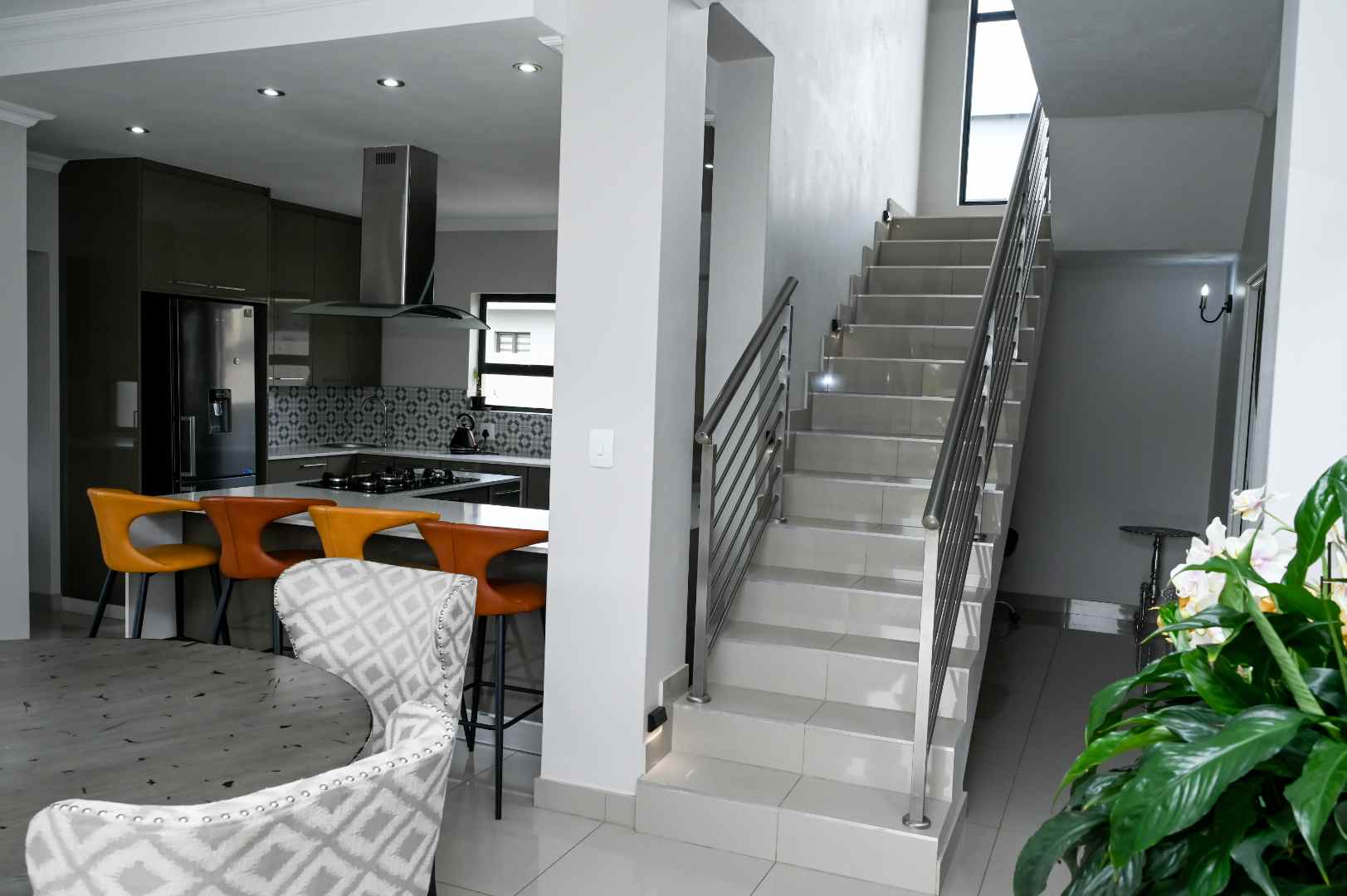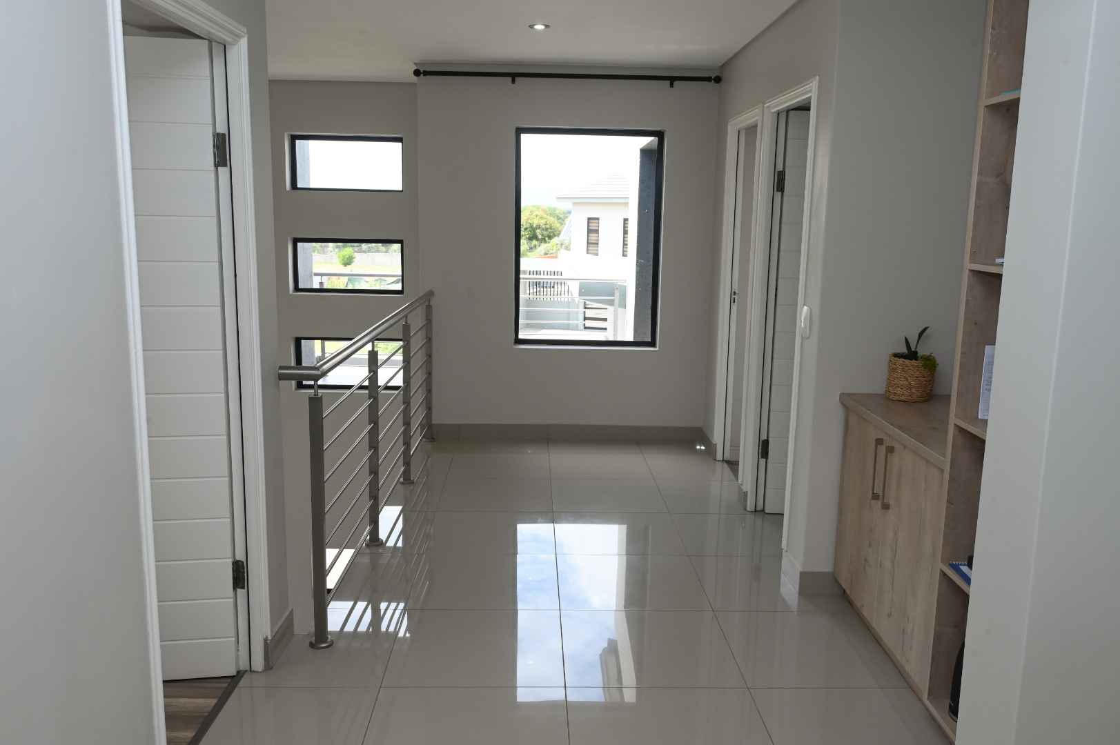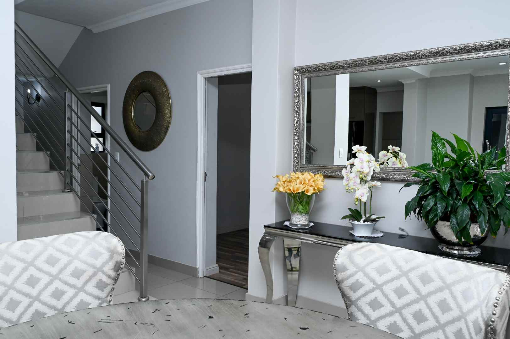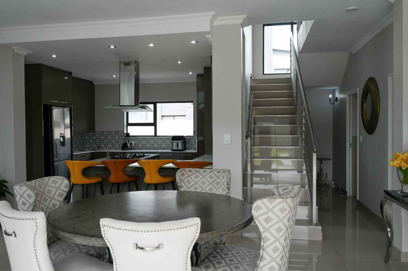 The home features generous open-plan living areas, including a well-appointed kitchen, scullery, and dining room. On the ground floor, you'll find a large guest bedroom with an en-suite bathroom, providing convenience and privacy for visitors. Upstairs, there are four additional bedrooms and five bathrooms. The master bedroom is a true retreat, offering ample cupboard space and a luxurious en-suite bathroom.