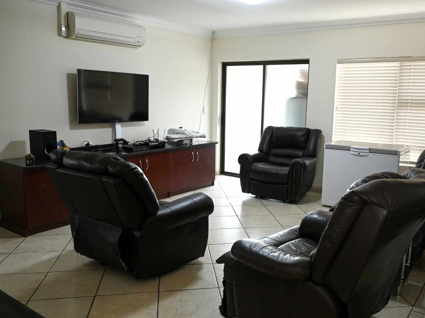 The spacious family/TV room, dining room, and lounge flow onto a spacious braai room with glass stack doors on two sides and and air conditioner, equipped with a built-in braai, providing a perfect view of the sparkling pool and beautifully landscaped garden.