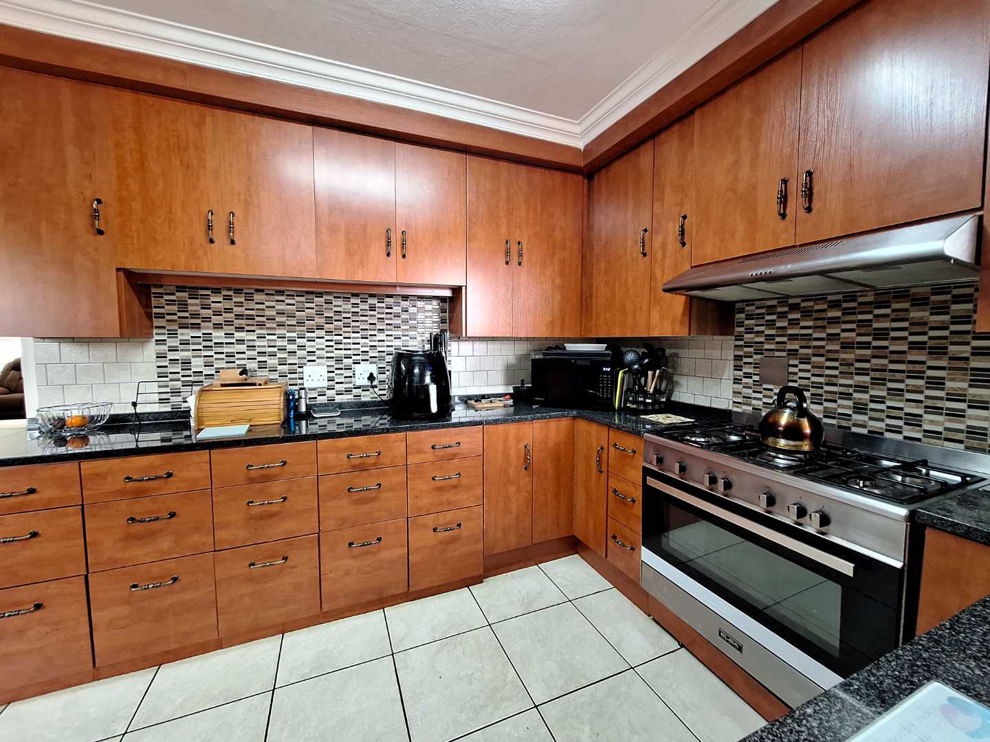 The expansive open-plan living areas are perfect for both relaxation and entertainment. The stunning modern kitchen is equipped with exquisite finishes, granite countertops, and abundant cabinetry, including an island and a practical grocery cupboard. It also features a breakfast nook, a modern gas oven as well as a gas stove, leading seamlessly to a convenient laundry/scullery area.